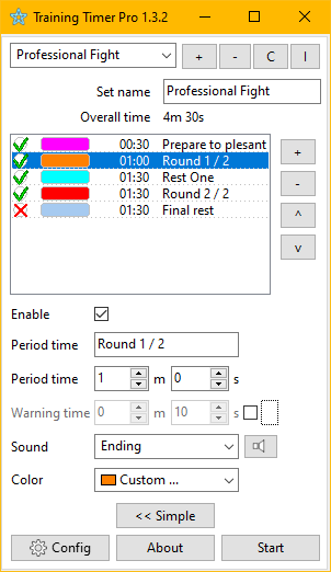 Professional mode allows you to set any custom time periods with any sounds and signal colors. You can create your own chains of periods: progressive, regressive, with an extended rest period in the middle, and much more.